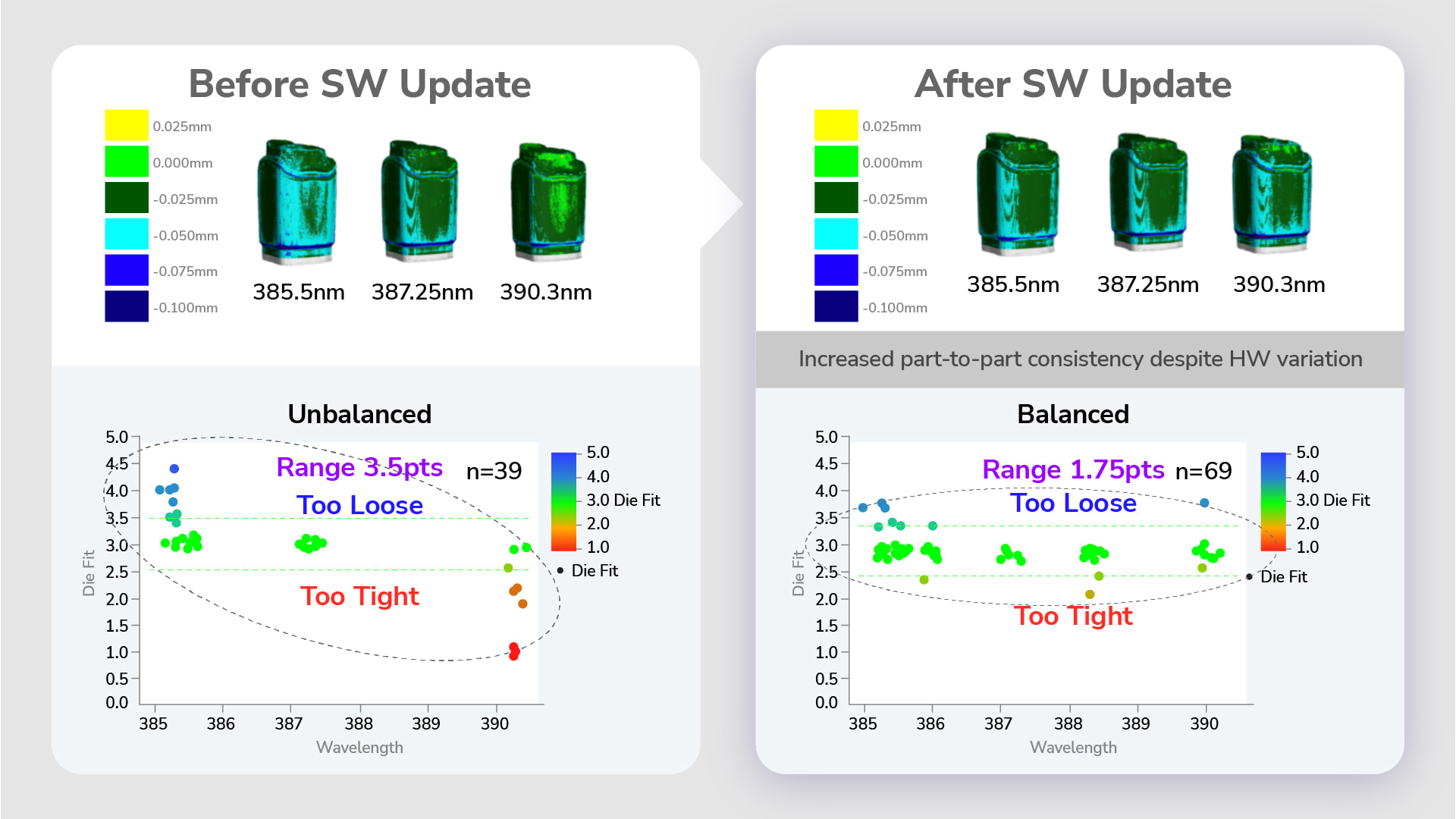Another example of reducing variation is compensation for printer peak light wavelength. Each Carbon printer contains a light source that is used to cure the resin. Even though the emission peak wavelengths of these light sources across the entire fleet of Carbon printers are held to the range of a few nanometers, the absorption characteristics of resins still vary enough to affect part dimensions by 10–20 µm. This is negligible in many applications, but for dental models and die, the die fit is extremely sensitive to dimensional changes. A die can be perceived as “too loose” or “too tight” with only slight dimensional change (as seen following from careful X-ray CT scan data). Launched via a software update to Carbon printers, compensation for printer peak wavelength reduces variation, so consistent die fit is observed across a customer’s fleet of printers.