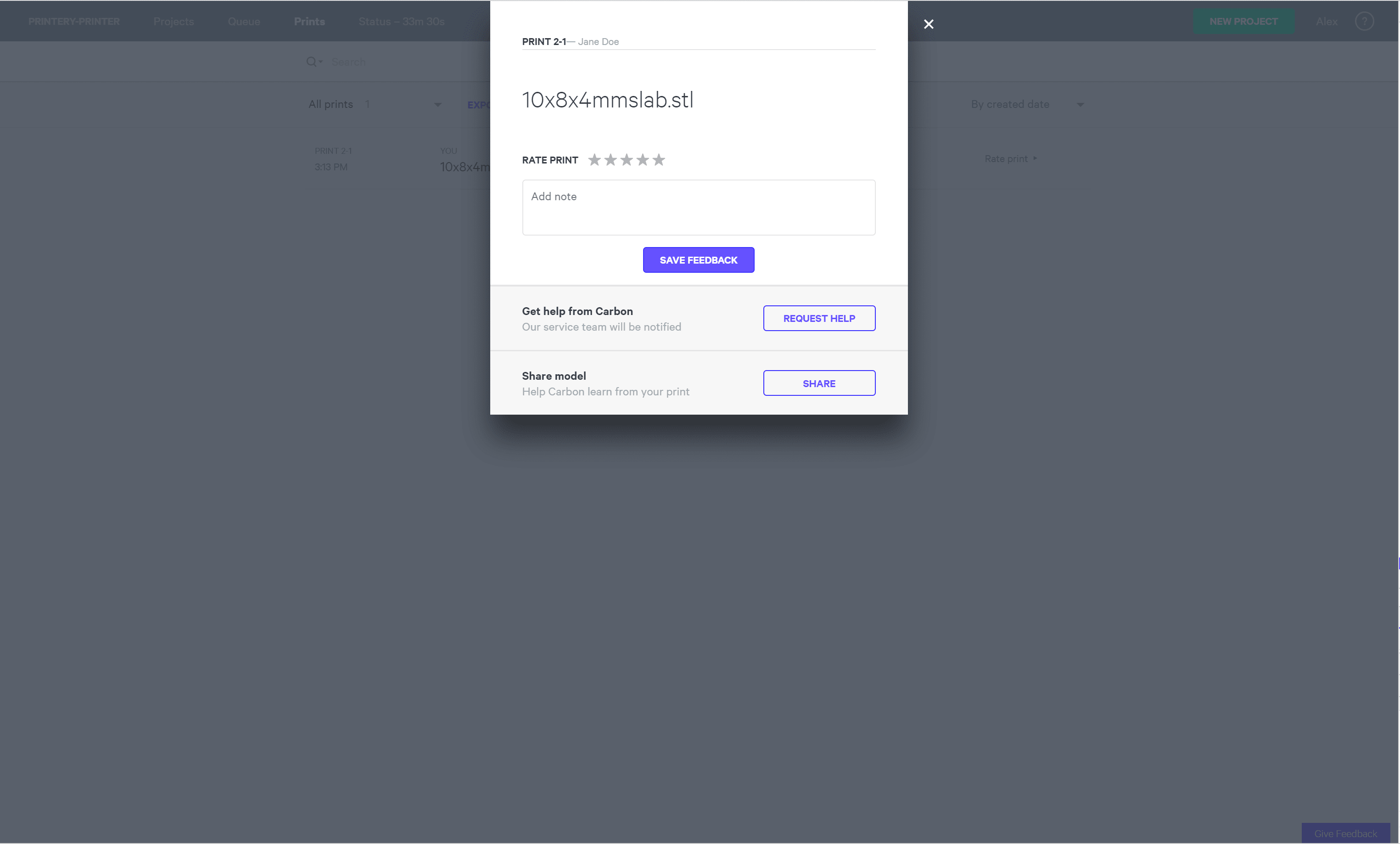 Figure 2: In Carbon’s print interface, requesting help with a print is seamless. If a customer chooses to share their part, it is clearly labeled and requires confirmation that they intend to share their part with Carbon.